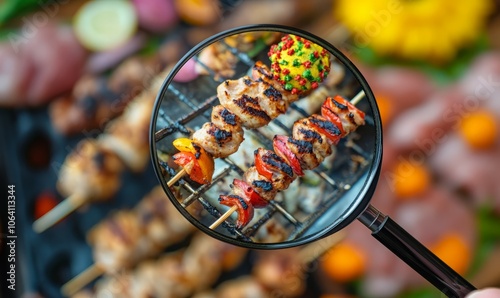 grill, meat, food, cook, roast, skewer, dinner, meal, beef, picnic, vegetable, bar-b-q, epicure, party, summer, lunch, steak, bar-b-q, onion, hot, chicken, pork meat, tasty, fire, magnifying, glasses, intricate, detail, grilled, lamb, kebob, colourful, icon, vibrant, dining, setup
