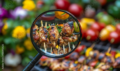 A magnifying glass reveals intricate details of grilled chicken and lamb kebabs, complemented by colorful coronavirus icons above, in a vibrant outdoor dining setup