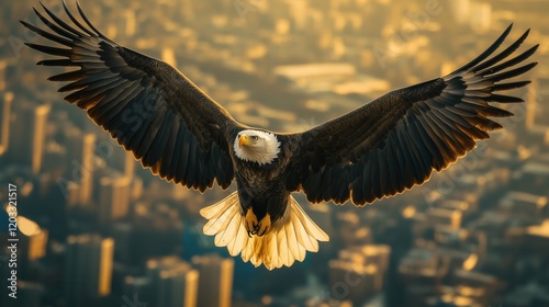 A majestic bald eagle soars high above the city, its wings spread wide and sharp gaze fixed on the horizon.
