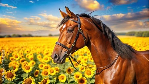 A majestic Bay horse wearing a golden bridle in front of a field of bright yellow sunflowers on a sunny day, with a gentle breeze rustling its mane, outdoors, farm