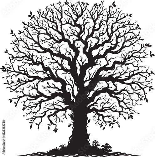 A majestic black silhouette of a large, sprawling tree with intricate branches and a thick trunk, set against a stark white background, evokes a sense of age, strength, and enduring presence.