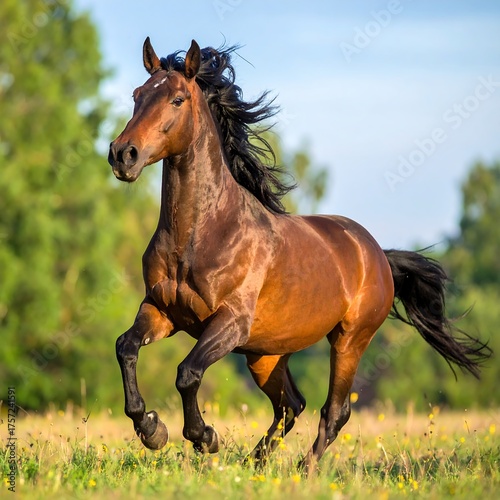 A majestic brown horse gallops through a sunlit field, its dark mane flowing in the wind. Green trees form a background