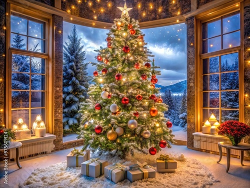 A majestic Christmas tree stands tall, adorned with sparkling ornaments, garlands, and twinkling lights, creating a warm and festive atmosphere in a cozy winter wonderland setting.