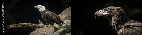 A majestic eagle and a fierce hawk captured in detail, showcasing their unique features against a dark backdrop.