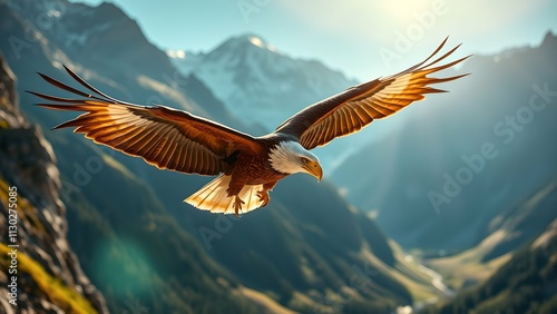 A majestic eagle dives toward its prey in a stunning mountain valley, its sharp talons and feathers illuminated by the bright sunlight, while dramatic mountain peaks rise powerfully in the background.