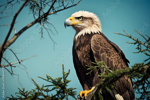 eagle, majestic, breathtaking, realistic, perched, tree branch, sturdy, towering, tree, gold, eye, confident, sharp, talon, gripping, bark, detailed, feather, rich, brown, striking, white, sunlight, glossy, plumage, background, clear, blue, sky, scattered, cloud, panoramic, lush, green, forest, strength, freedom, grandeur, nature, powerful, wild, scenic, vibrant, iconic, soaring, natural, wilderness, symbolic, inspiring