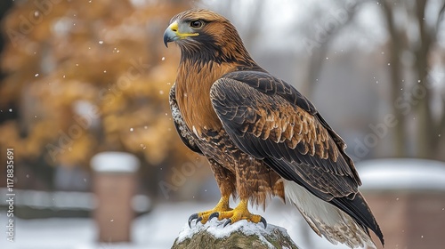 eagle, bird, wildlife, nature, winter, snow, feather, majestic, animal, bird of prey, perch, outdoors, landscape, hunting, predator, beauty, wing, strength, cold, environment, scenery, wild, freedom, sharpened, grace, sharp, eye, brown, yellow, claw, forest, tree, tranquil, serene, snowflake, habitat, avian, powerful, elegant, fauna, season, natural, ecosystem, observation, flight, birding