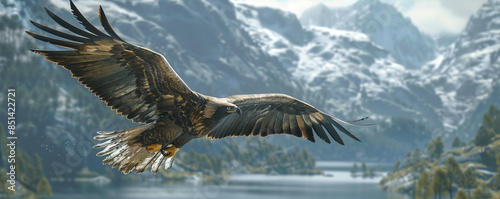 A majestic eagle soaring through the sky, its wings outstretched as it surveys the landscape below.