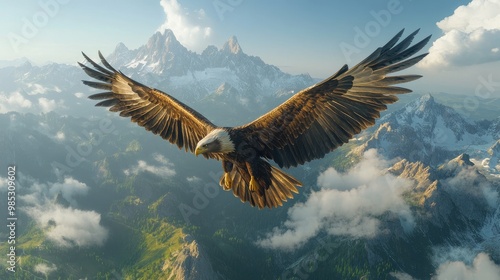 sky, majestic, bird, nature, flying, blue, mountain, horizontal, photo, animal, beauty, outdoors, eagle, feather, no people, us, wing, color image, cloud, bald eagle, bird of prey, flight, freedom, sun, one animal, snow, symbol, awe, fly, silhouette, vertebrate, wildlife, copy space, motion, soaring, art, animal themes, clear sky, mountain chain