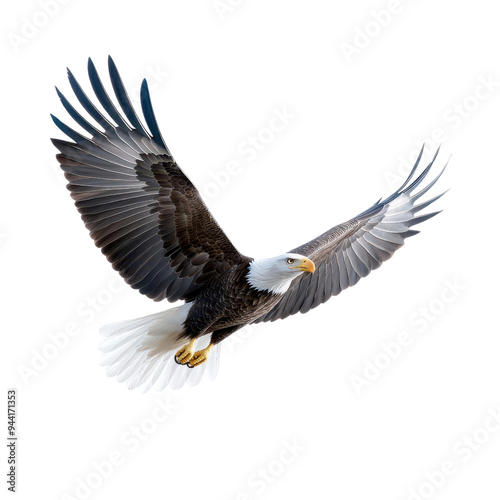A majestic eagle soaring through the sky, showcasing its powerful wings and striking features in a dynamic flight posture.