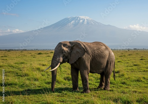 A majestic elephant roams the African plains with the towering Kilimanjaro mountain in the distance, capturing the raw beauty of wildlife and nature. Sunrise casts a golden glow.