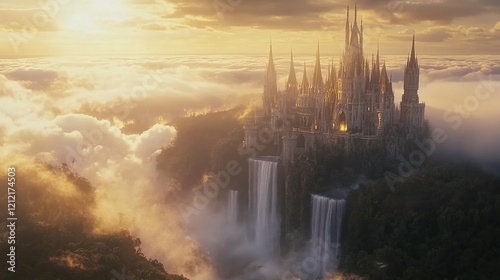A majestic fantasy castle in the clouds, with waterfalls and lush greenery below, golden sunlight shining through its spires