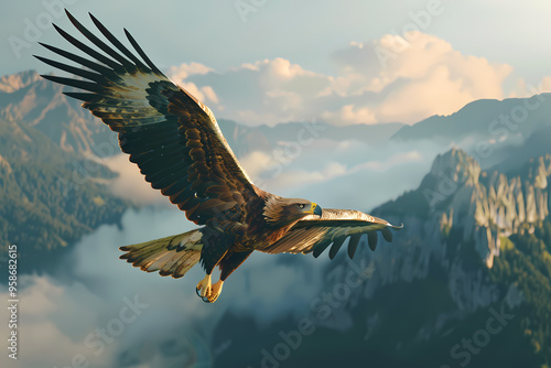 A majestic golden eagle soars over a stunning mountain landscape, showcasing its powerful wings and keen gaze. Nature's grace in flight.