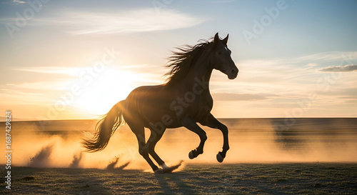horse, animal, mammal, equine, fast horse, mare, bay, silhouette, running, gallop, speed, motion, freedom, wild, nature, landscape, field, prairie, plain, horizon, sky, sunset, sunrise, light, gold, warm, sun, ray, dust, earth, ground, grass, mane, tail, leg, body, muscle, powerful, energy, vibrant, dynamic, movement, outdoors, wilderness, beauty, scenic, tranquil, calm, majestic