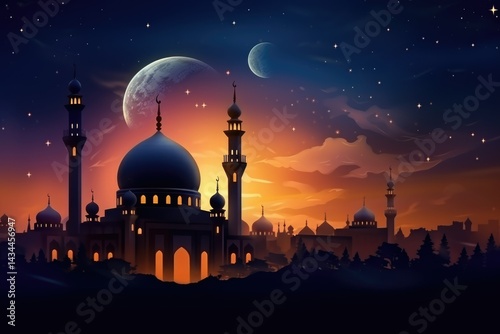 mosque, islam, muslim, ramadan, eid, sunset, night, star, moon, crescent, architecture, religion, faith, spirituality, prayer, peace, serenity, silhouette, landscape, city, building, dome, minaret, tower, arabic, islamic, culture, tradition, belief, holy, sacred, beautiful, scenic, artwork, illustration, digital artwork, fantasy