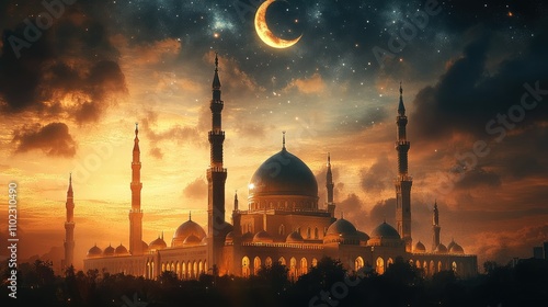 A majestic mosque silhouette against a sunset sky with a crescent moon and stars.