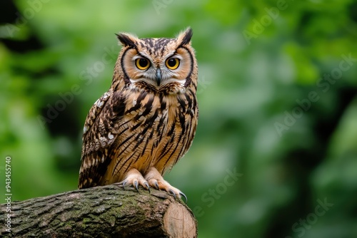 A majestic owl with piercing yellow eyes is perched on a branch, surrounded by lush green foliage. The owl’s intense stare is both captivating and slightly intimidating.