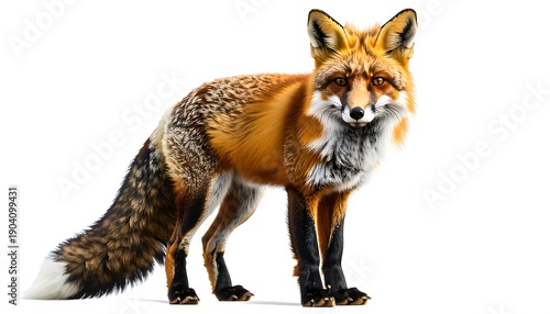 fox, red, animal, wildlife, nature, mammal, canino, predator, fur, tail, bushy, orange, white, black, alert, standing, portrait, closeup, detail, isolated, studio, background, cute, adorable, wild, forest, timberland, creature, fauna, wilderness, outdoors, natural, beautiful, elegant, graceful, intelligent, curious, watchful, keen, eye, ear, nose, whisker, paw, leg, body, head, face, vibrant