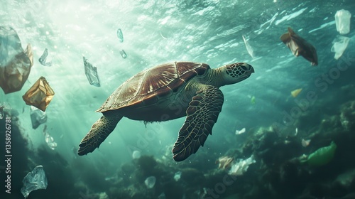 A majestic sea turtle gracefully navigating a sea of plastic, a poignant reminder of ocean pollution's devastating impact, captured in a dramatic underwater scene.