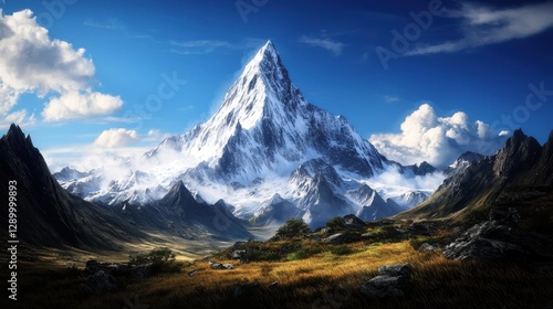 A majestic snow-capped mountain rises against a blue sky, surrounded by lush green valleys and soft white clouds, creating a stunning natural landscape.
