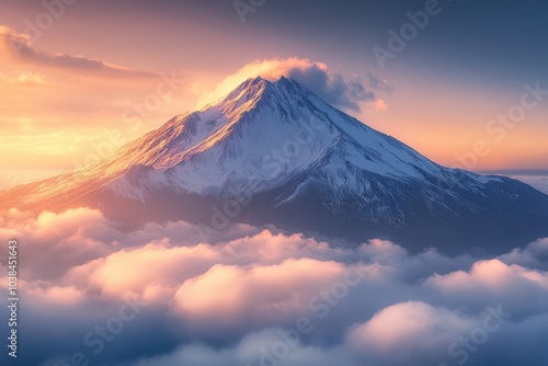 A Majestic Snowy Mountain Peak Rising Above Clouds at Sunset