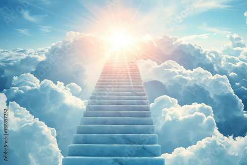 A majestic stairway leading into bright clouds, symbolizing hope and ascension towards a radiant light.