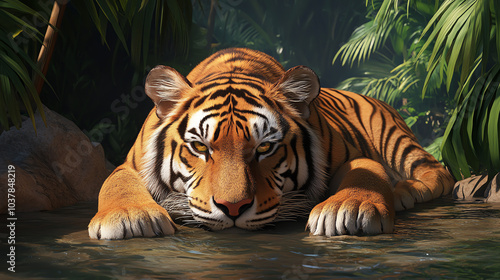 A majestic tiger lounging by the water, surrounded by lush greenery, showcasing its powerful beauty and striking orange and black stripes.