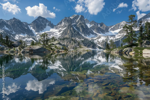 A majestic vista of snow-capped mountains mirrored in the crystal-clear waters of a serene alpine lake, surrounded by towering pine trees and rugged wilderness.