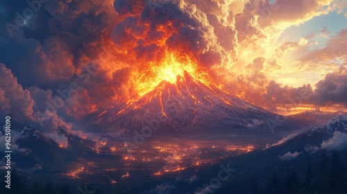 A majestic volcano erupts, spewing lava and ash into the fiery sky, casting an ominous glow over the surrounding landscape.