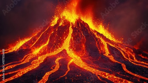 A majestic volcano erupts with vibrant lava flowing down its sides, casting a fiery glow against the dark sky.