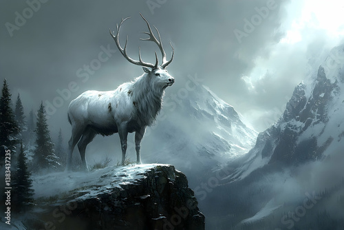elk, white, animal, antler, snow, mountain, landscape, winter, cold, nature, wilderness, fog, cloud, sky, rocky, cliff, tree, pine, forest, ice, icy, majestic, serene, peaceful, strong, standing, portrait, viewpoint, up high, elevation, view, scene, background, environment, beauty, wild, mammal, horn, peak, artistic, illustration, painting, artwork, dramatic, scenic, isolated, tranquil