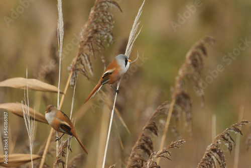 A male and female Bearded Tit, Panurus biarmicus, feeding on reed seeds growing at the edge of a lake.