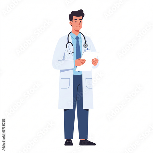 doctor, health care, medicine, medicals, professional, clinic, hospital, uniform, coat, stethoscope, clipboard, patient, diagnosis, treatment, health, care, wellness, exam, physician, practitioner, specialist, therapy, consultation, check-up, well-being, science, research, cognition, expertise, skilled, confident, male, adult, person, individual, standing, pose, illustration, drawing, cartoon, vector, graphic, design, isolated, white, background, body, head, hair
