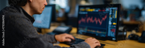 A male financial analyst sits at his desk in an office, intently analyzing graphs and data on two screens, showcasing the importance of data in modern finance and investment.