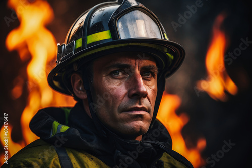 A male firefighter with a cloud of fire and smoke in the background. 911 is a firefighter fighting fire. Brave people dangerous work. dangerous situation, the intensity and bravery