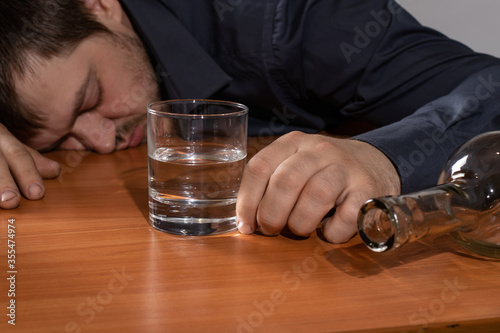 A man and a glass of vodka. Alcoholism, alcohol addiction, delirium tremens.