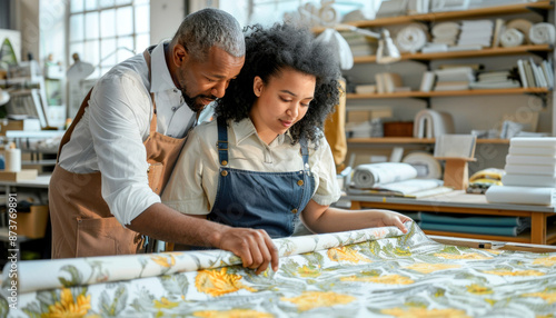 A man and a woman are looking at a variety of fabric rolls together while shopping at a store