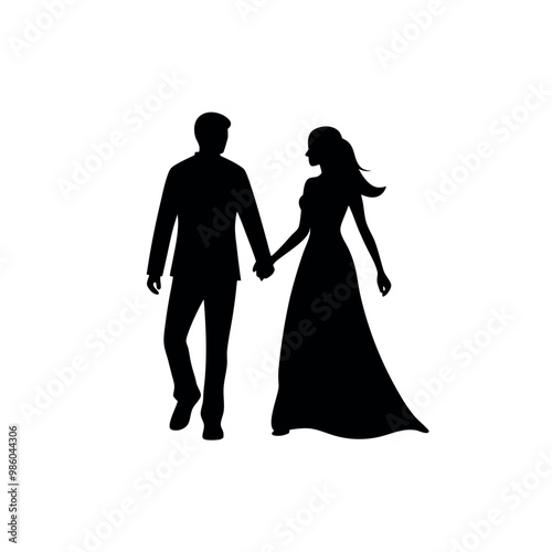 a man and a woman walking hand in hand. The man is on the left side of the image and the woman is in the center. vector silhouette isolated white background