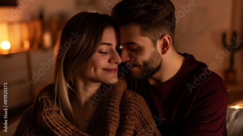 man, woman, late, 30s, couple, sitting, together, human relationships, partner, husband, wife, adult, indoor, casual attire, relaxed, companionship, friendly, communication, interaction, connected, bond, married, pair, people, sex, family, caucasian, brunette, denim, blue, shirt, blouse, jean, leisure, lifestyle, togetherness, harmony, middle-aged, love, affection, care, comfort, support, understanding, partnership, affectionate, seated, close, intimate