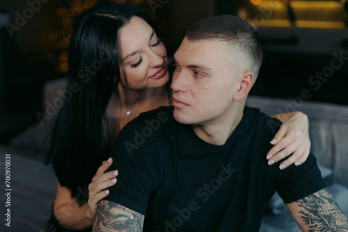 man, woman, sitting, cosy, couple, relaxation, comfort, love, human relationships, together, intimate, peaceful, calm, leisure, rest, affection, romance, happiness, joy, connection, bonding, companion, home, domestic, lifestyle, female, male, girl, boyfriend, girlfriend, hug, hugs, back, bed, bedchamber, hotel, vacation, date, sex, tattoo, tattooed, honeymoon, romantic, indoor, inside, people, relax, seduction, seductive, caucasian