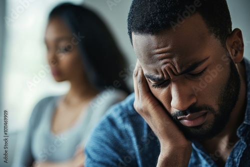 A man appears upset, holding his head in one hand, while a blurred woman is in the background, highlighting themes of stress and interpersonal issues.