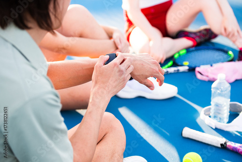 man, check, watch, conversation, sport, friends, sitting, group, hand, device, digital, practice, tennis, court, wrist, tennis racket