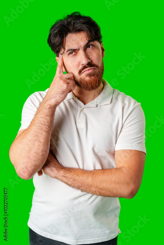 man, thoughtful, contemplation, pensive, expression, sharpened, thinking, meditation, coiffure, beard, emotion, background, individuality, male, mood, scene, pondering, appearance, concentration, questioning, curiosity, seriousness, uncertainty, adulthood, posing, interest, wondering, green