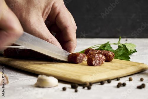 a man cuts spicy smoked sausages on a cutting board next to red pepper garlic spices and herbs on the table