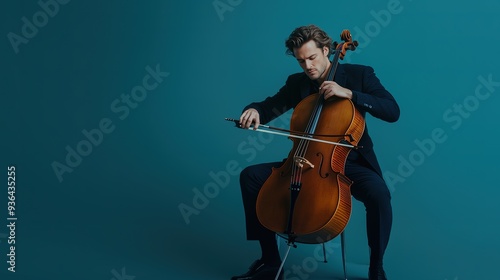 a man engrossed in playing the cellos, positioned to the left of the frame against a solid light blue background