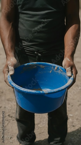 man, bucket, blue, sand, cement, mixture, holding, arm, dirt, ground, construction, material, person, work, men at work, labor, manual, labourer, building, site, outdoors, daylight, day, male, adult, hand, carry, heavy, duty, tough, strong, strength, hard, dirty, dirtied, grit, aggregate, particle, grain, earth, dust, sediment, texture, surface