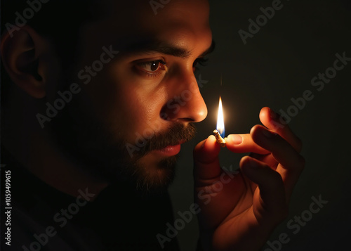 A man holds a lit cigarette close to his face in a very intimate pose.
