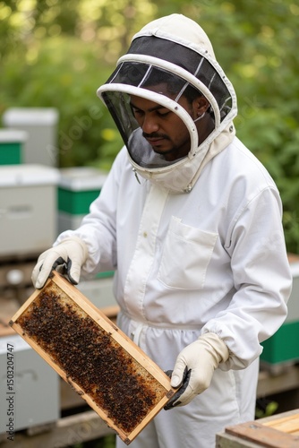 A man in a bee suit holding a beehive full of honey.