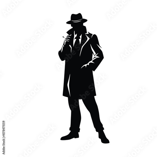 man, black, coat, hat, smoking, cigarette, standing, front, white, background, vector, silhouette, illustration, character, drawing, male, head, person, symbol, style, fashion, graphic, retro, gentleman, suit, spy, gangster, business, human, old, mysterious, elegant, engraving, vintage, portrait, icon, art, hand, adult, design, mafia, detective, dark, shadow, vignetting, figure, logotype, cowboy, cartoon