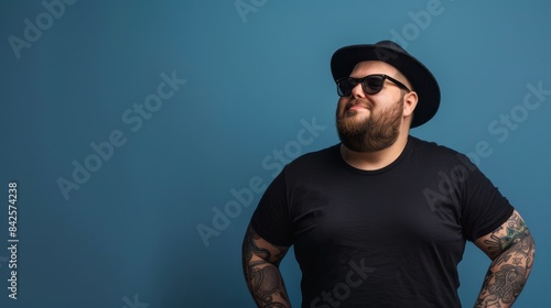 t-shirt, man, person, male, adult, model, wearing, t-shirt, black, shirt, fedora, hat, sunglasses, beard, looking, upward, gaze, blue, teal, background, studio, portrait, fashion, clothing, apparel, style, casual attire, relaxed, cool, confident, trendy, design, brand, graphic, image, photo, photo, visual, concept, idea, inspiration, advertisement, marketing, branding, everyday, comfortable, stylish